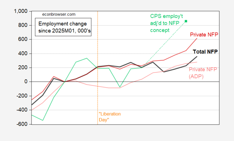 Figure 1: Official BLS nonfarm payroll employment (bold black), official BLS private nonfarm payroll (dark red), ADP private nonfarm payroll employment (light red), civilian employment adjusted to NFP concept, 3 month centered moving average (light green), change since 2025M01, in 000’s s.a. Source: BLS, ADP via FRED, BLS, and author’s calculations.