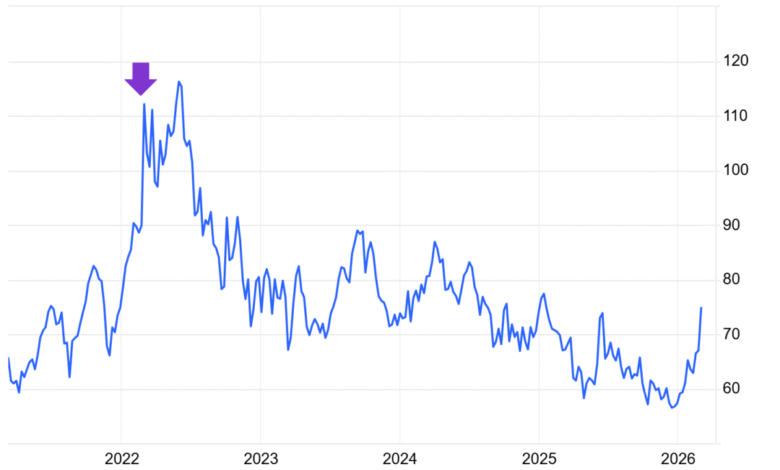 Figure 1: WTI oil price, $/bbl. (blue). Purple arrow at Russian invasion of Ukraine.
