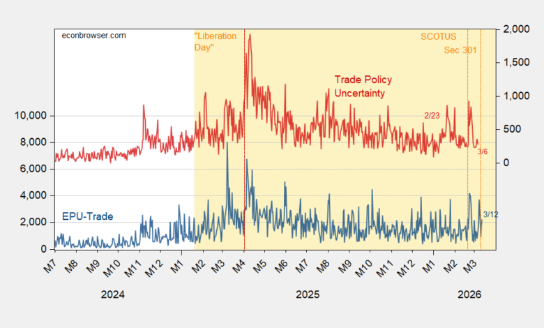Figure 1: EPU-trade (blue, left scale), TPU (red, right scale). Source: policyuncertainty.com and TPU.