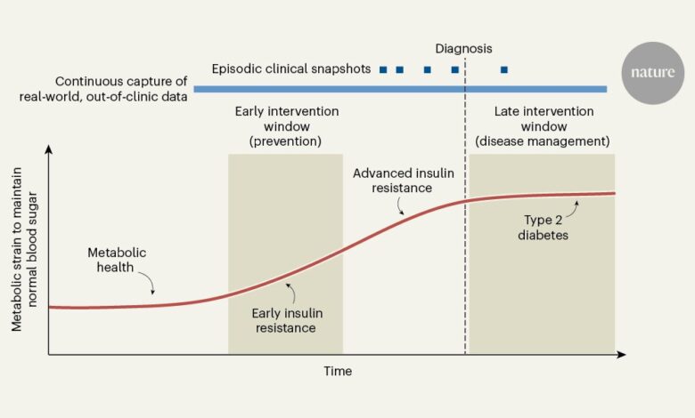 Many chronic diseases unfold slowly as continuous biological processes, yet they are typically detected through brief clinical snapshots — at annual visits to a physician or from isolated laboratory tests, for instance. Insulin resistance, a condition in which the body must work harder to regulate blood sugar, can develop for years before it becomes visible in routine diagnostics. Writing in Nature, Metwally et al.1 show that patterns in everyday-lifestyle data, collected outside the clinic from consumer wearable devices, can reveal this hidden phase earlier. Rather than a snapshot, this offers something closer to a ‘movie’ of metabolic health. By drawing on continuous signals from daily life, the authors’ approach highlights physiological strain that is invisible to episodic testing. The work raises the possibility that identifying insulin resistance — a key early feature of type 2 diabetes — earlier could enable simpler interventions and, ultimately, reduce the downstream burden of metabolic disease.