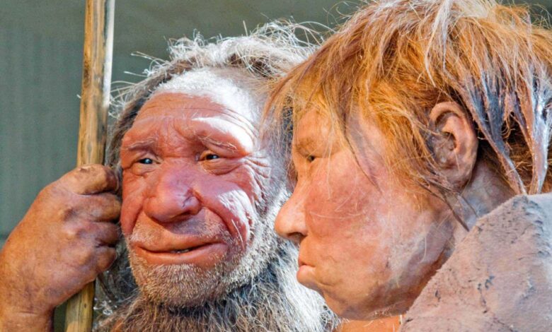 Reconstructions of a Neanderthal man and woman at the Neanderthal Museum in Mettmann, Germany