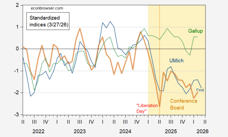 Figure 1: U.Michigan Economic Sentiment (blue), Conference Board Confidence Index (brown), Gallup Confidence level (green), all demeaned and divided by standard deviation 2021M01-2025m02. March 2026 U.Mich sentiment is final. Red dashed line at “Liberation Day” Source: UMichigan, Gallup, Conference Board, and author’s calculations.