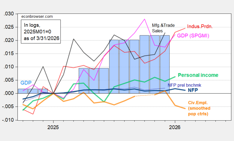 Figure 1: Nonfarm payroll (NFP) employment preliminary benchmark revision (thin blue), NFP employment (bold blue), civilian employment with smoothed population controls (bold orange), industrial production (red), personal income excluding current transfers in Ch.2017$ (bold light green), manufacturing and trade sales in Ch.2017$ (black), and monthly GDP in Ch.2017$ (pink),GDP (blue bars), all log normalized to 2025M01=0. Source: BLS via FRED, BLS, Federal Reserve, BEA 2025Q4 2nd release, S&P Global Market Insights (nee Macroeconomic Advisers, IHS Markit) (3/23/2026 release), and author’s calculations.