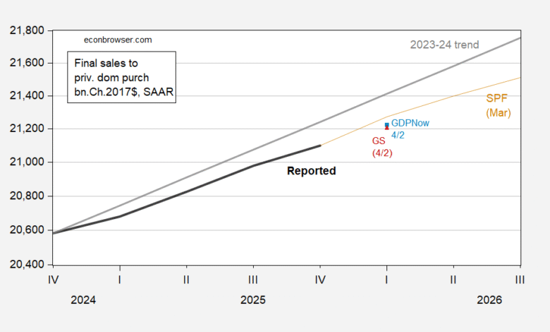 Since the series are plotted on a log scale, it’s clear that “core GDP” is decelerating, both relative to the 2023-24 trend, and the March Survey of Professional Forecasters median.