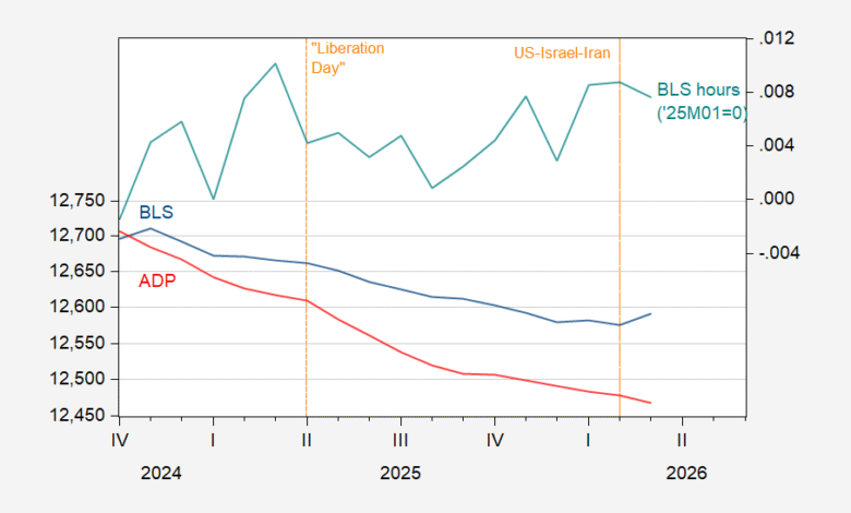 Figure 1: Manufacturing employment from BLS CES (blue, left log scale), from ADP (red, left log scale), in 000’s, s.a., total hours in manufacturing, production and nonsupervisory workers, in logs 2025M01=0 (teal, right scale), s.a. Source: BLS, ADP via FRED, and author’s calculations.