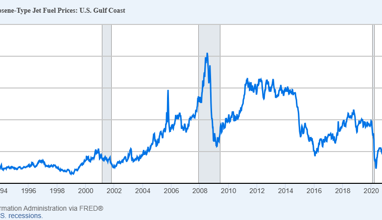 Jet fuel price, from EIA via FRED: