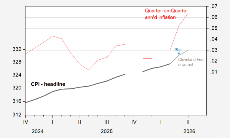 Figure 1: CPI as reported (bold black, left log scale), Cleveland Fed nowcast (gray, left log scale), Bloomberg consensus (light blue +, left log scale), Quarter-on-Quarter annualized CPI headline inflation using nowcasts (red, right scale). Source: BLS, Cleveland Fed accessed 4/7, Bloomberg, and author’s calculations.