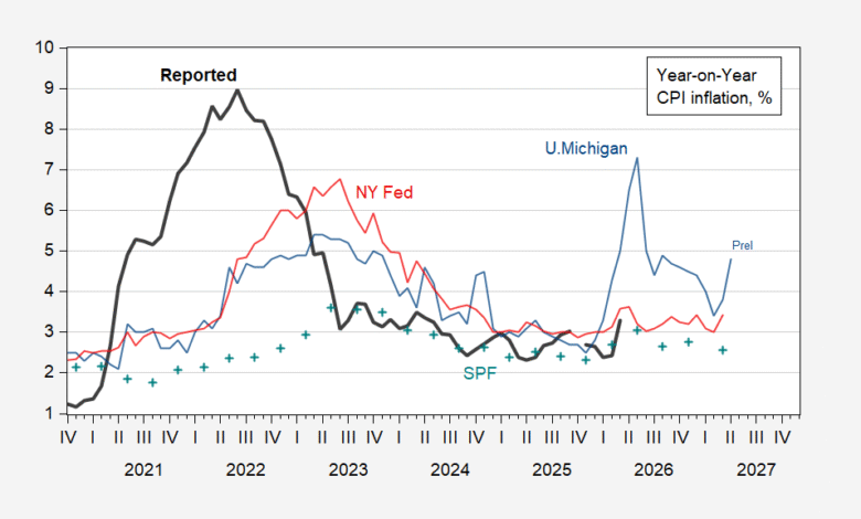 Figure 1: Year-on-Year CPI inflation (bold black), U. Michigan expected (blue), NY Fed (red), and Survey of Professional Forecasters (teal +), all in %. Source: BLS, U.Michigan, NY Fed, Philadelphia Fed, and author’s calculations.
