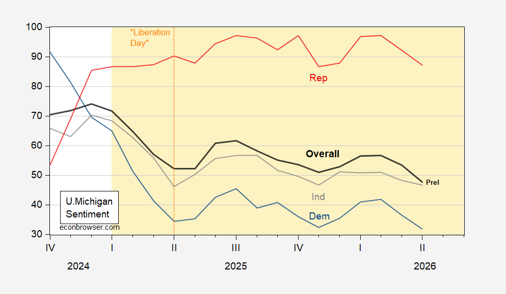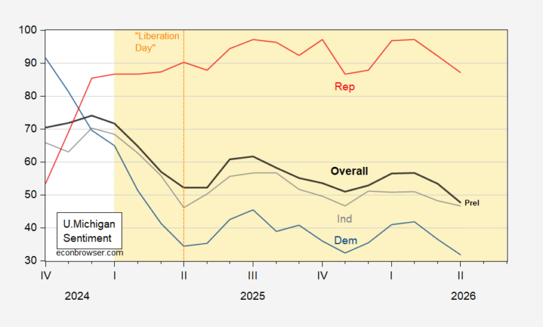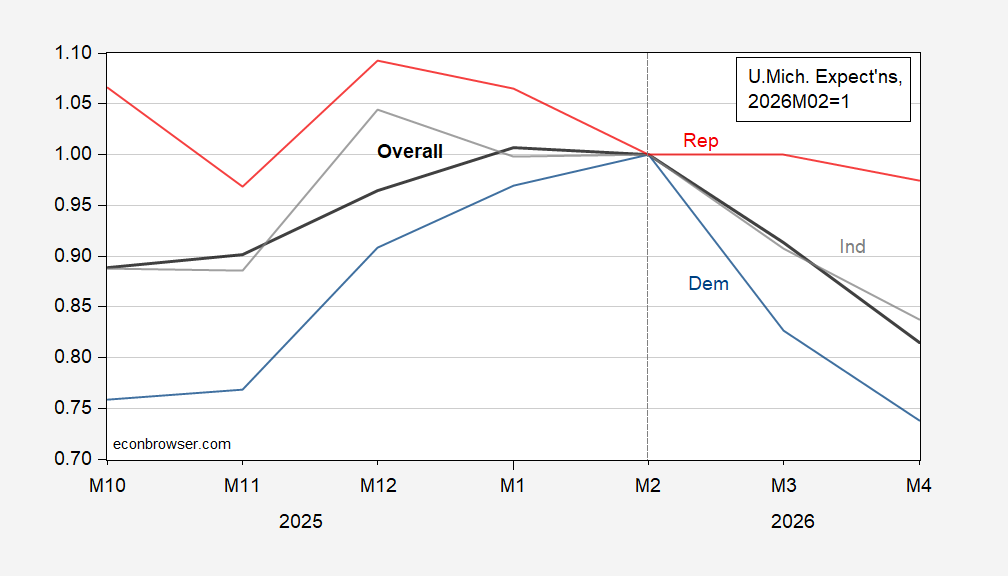 Figure 1: Change from February 2026 levels in U.Michigan Overall Consumer Expectations (bold black), Democratic/Lean Democratic (blue), Independent (gray), Republican/Lean Republican (red). April is preliminary. Source: U. Michigan, and author’s calculations.