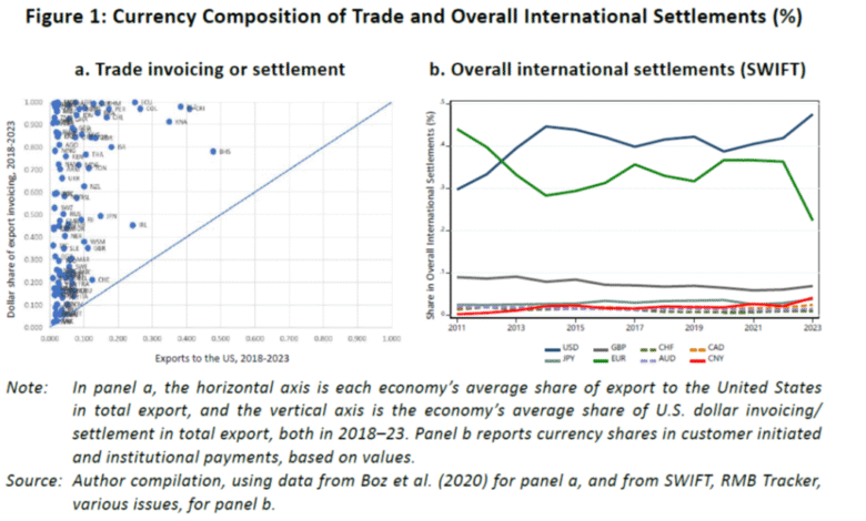The most prominent role of the USD is for trade invoicing or settlement. Gopinath (2015) points out the dollar’s outsized role in invoicing half or more of international trade. Figure 1a illustrates the shares of the dollar in export invoicing or settlement for individual countries (y-axis) compared to the shares of their total exports that are destined for the United States (x-axis). The figure demonstrates how economies rely more on the dollar for international trade than their trade relationships with the United States might suggest. If the dollar did not play a dominant role, one would expect its invoicing/settlement share in export transactions of economies to be proportional to the share of the United States as a destination for an economy’s exports. The figure clearly indicates that economies invoice or settle their exports in the dollar much more than proportionally in line with the share of their exports to the United States.
