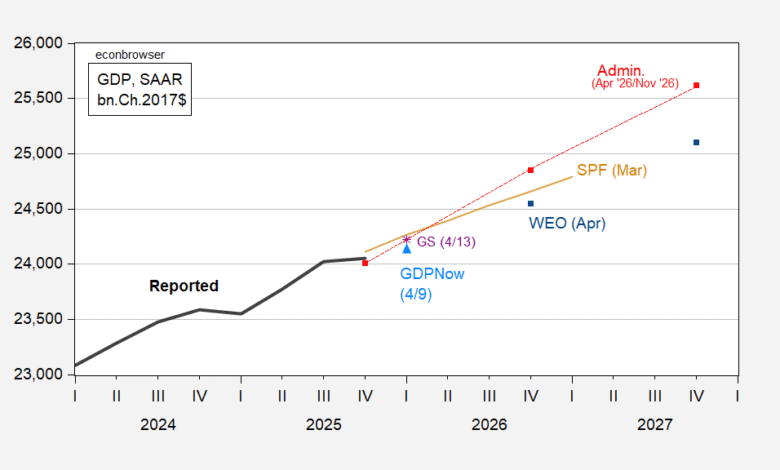 The Administration forecast was finalized based on early November data, and so does not include the impact of the war. However, as noted in this post, the idiosyncrasy of the Administration forecast is not entirely — or even mostly — due to date of the forecast. Contemporary forecasts showed the Administration forecast far outpacing comparators.