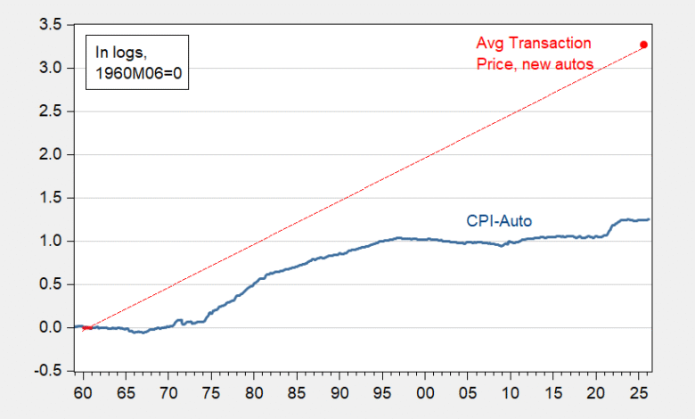 Figure 1: CPI-new autos (blue), average transaction price of a new auto (red), both in logs 1960M06=0. Source: BLS, Cox, and author’s calculations.