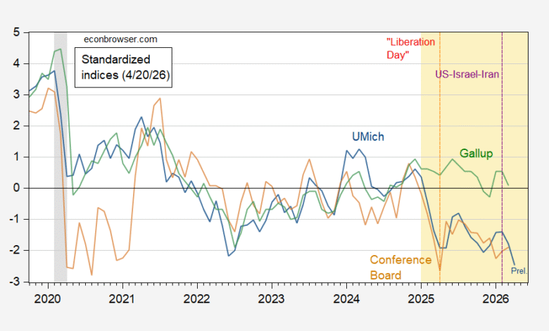 Figure 1: U.Michigan Economic Sentiment (blue), Conference Board Confidence Index (brown), Gallup Confidence (green), all demeaned and divided by standard deviation 2021M01-2025m02. Red dashed line at “Liberation Day” Source: UMichigan, Gallup, Conference Board, and author’s calculations.