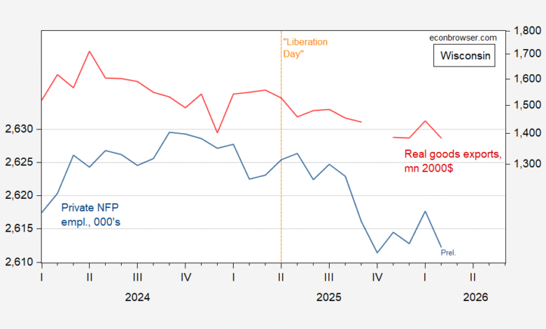 Wisconsin employment was rising through September 2024, and has been trending down since then. Real exports have been clearly falling since liberation day.