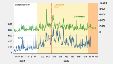 Daily data from Baker, Bloom and Davis: Figure 1: EPU (blue, left scale), EPU-trade (green, right scale).…